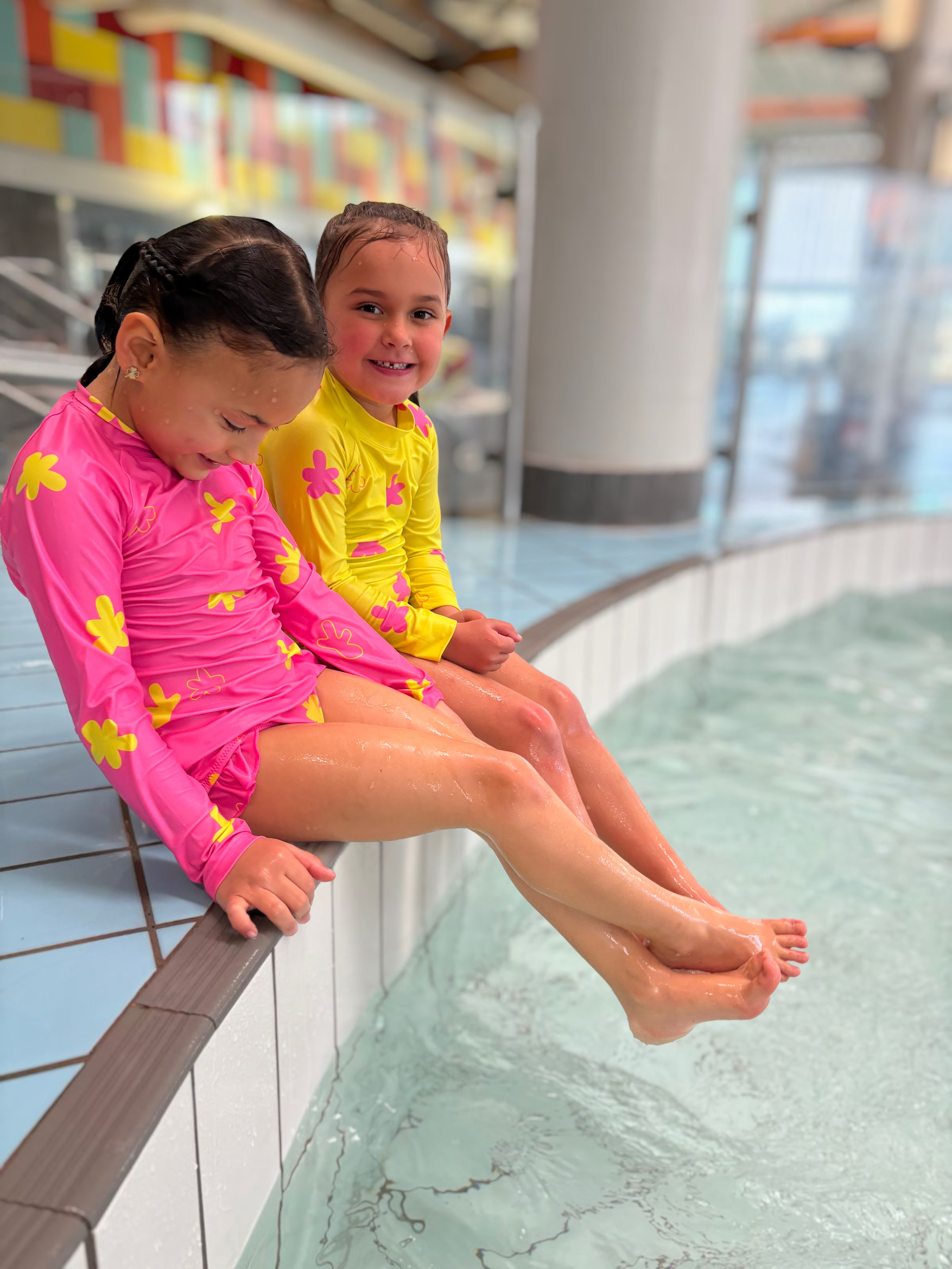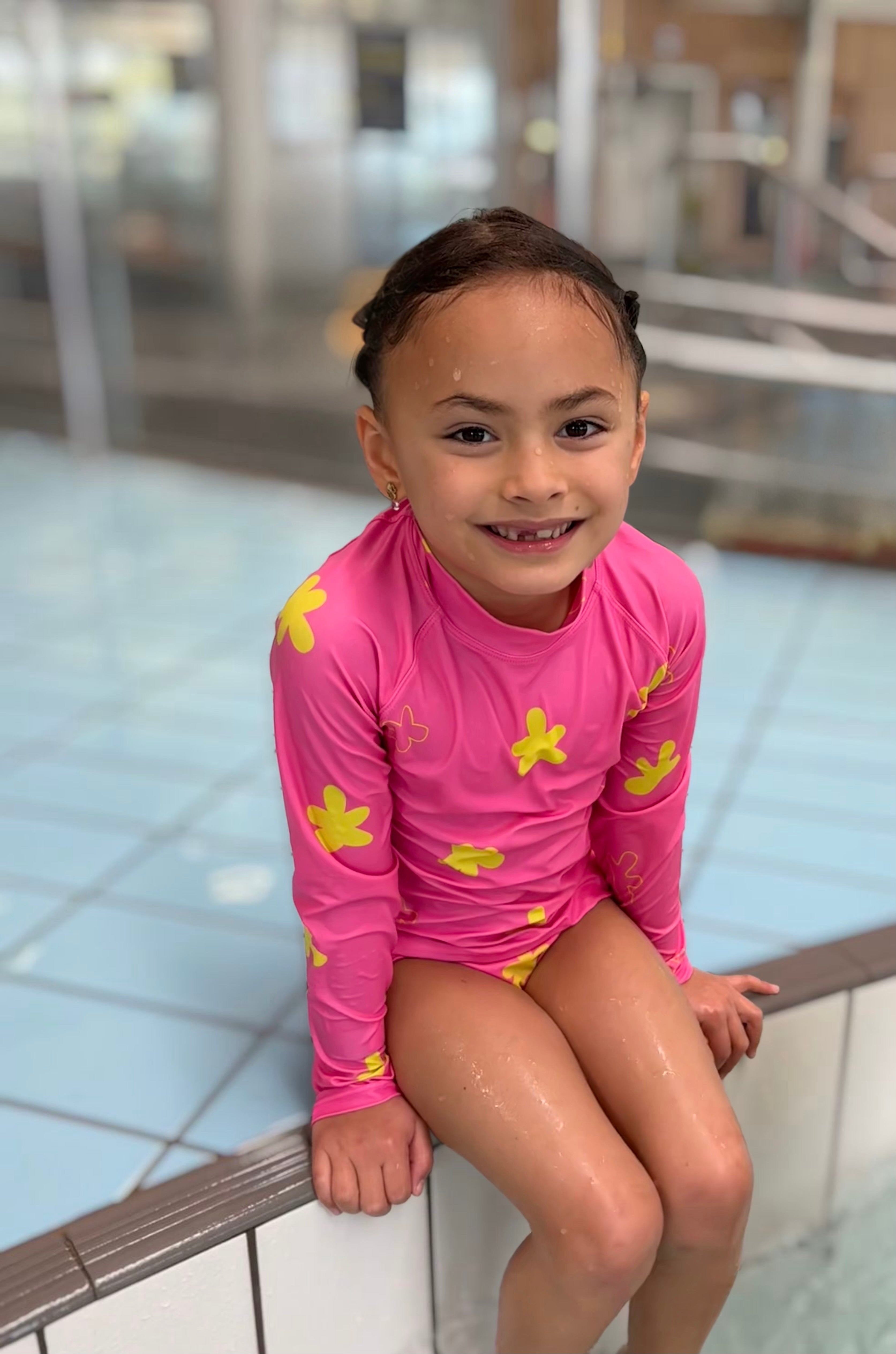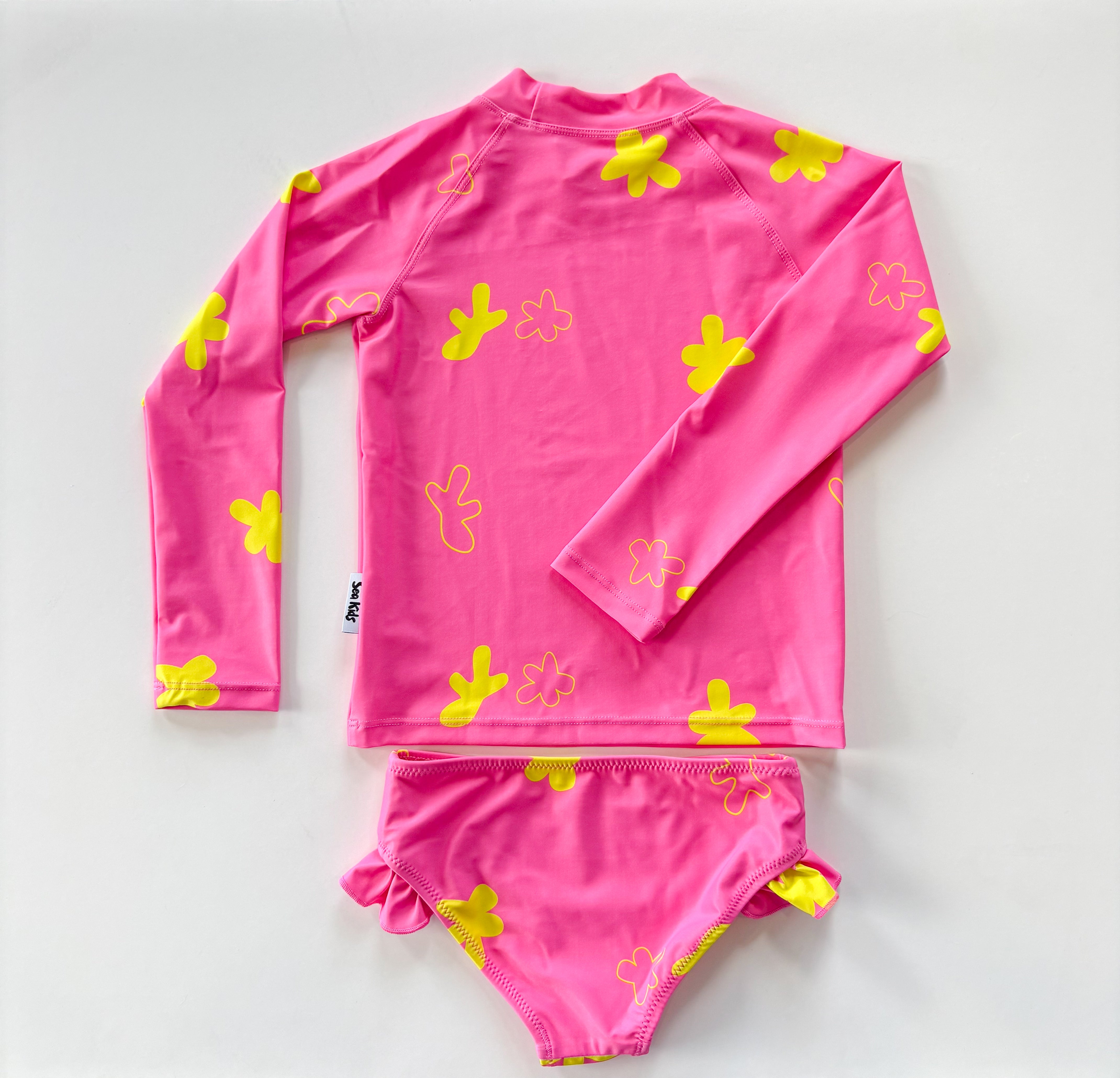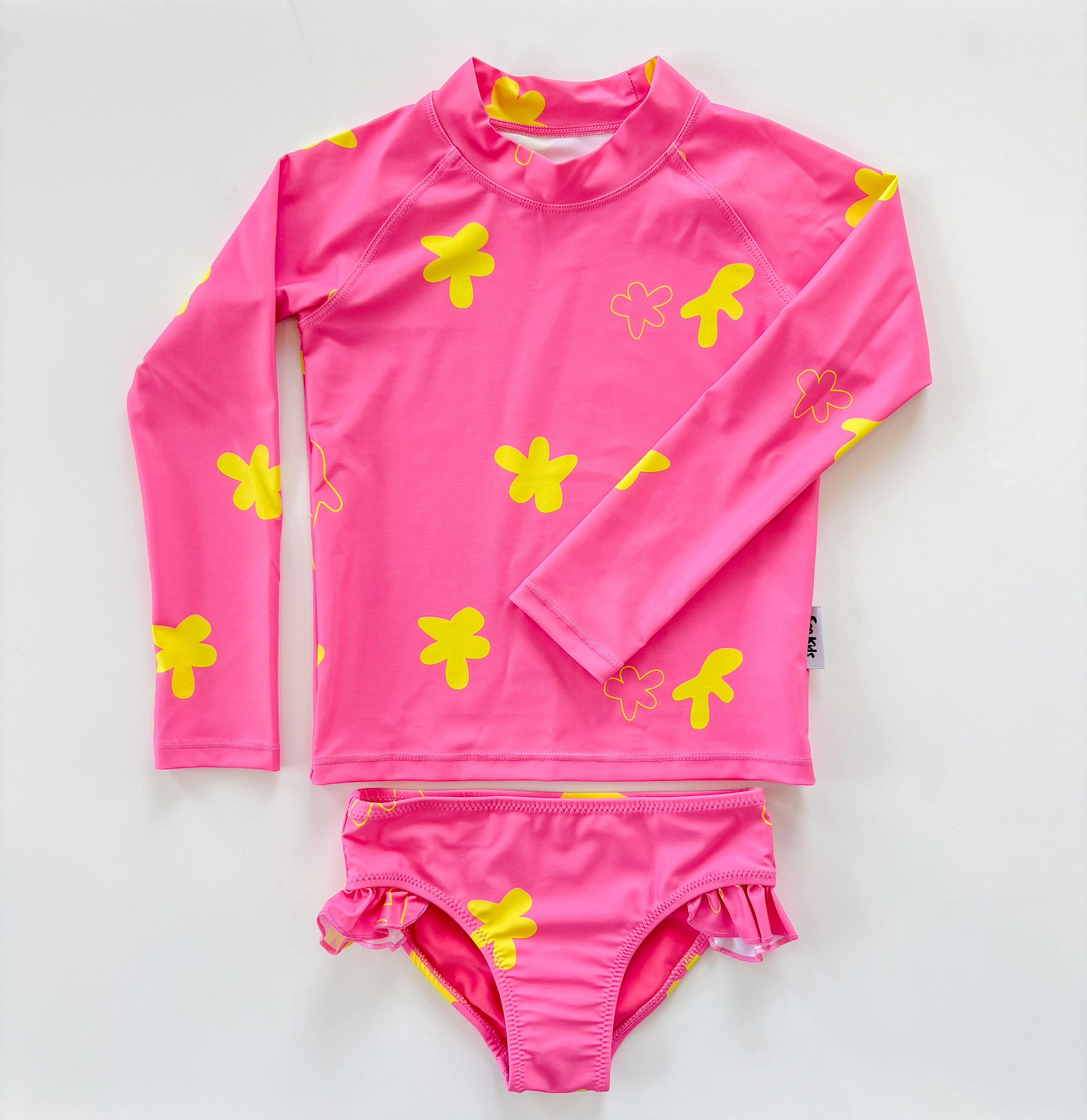 Your little ones will love to be seen in our long sleeve bikini. Designed for visibility, protection and comfort, our brightly coloured bikini set is UPF 50 plus rated and features a fun, eye-catching print in hot pink with bright yellow accents to enhance visibility in and out of the water.